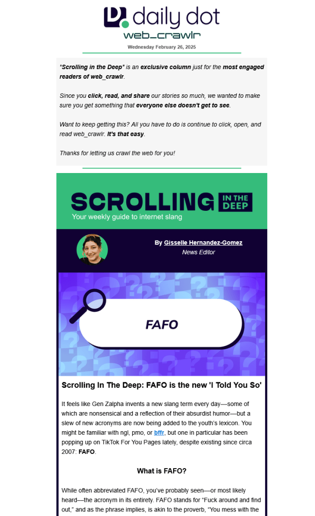 Here a few examples of some of the newsletters that were only sent to engaged subscribers of the newsletter, as a way to boost overall engagement. Click on the image below to see a PDF version of the full newsletter.